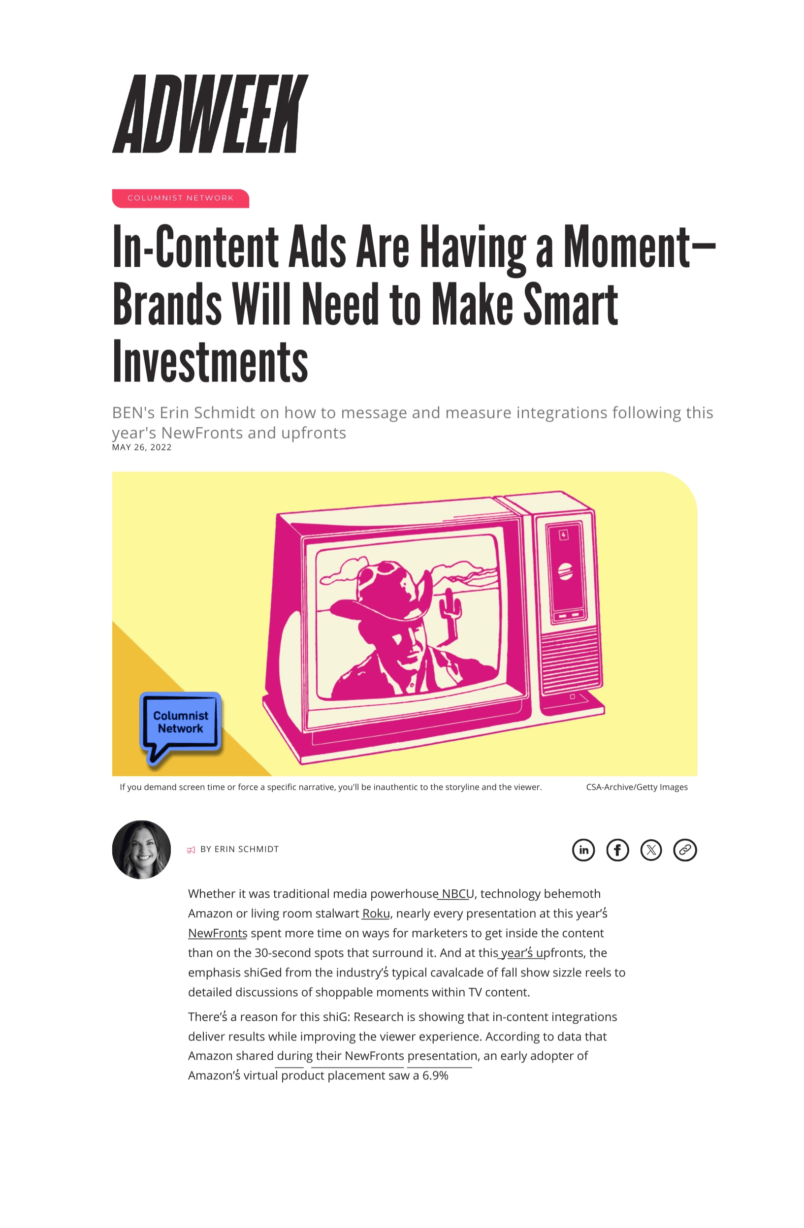 I translated these insights into a multi-year, omni-channel B2B marketing strategy spanning paid, earned, and owned channels. The effort began with a content partnership with advertising publication The Drum, through which we developed 'The Definitive Guide to Product Placement,' a practical playbook that directly addressed the objections our research had surfaced and gave marketers a clear framework for evaluating the channel. I secured executive visibility through major industry events including Cannes Lions and Advertising Week, and partnerships with Think LA, the Advertising Club of New York, and the ANA. In addition, opinion pieces and podcast appearances by BENlabs executives elevated the profile of our company among key decision-makers, while strategically placed op-eds in key advertising trades helped seed our perspective among our target audiences. We complemented this with earned media coverage in The New York Times, Wall Street Journal, Adweek, and Ad Age that raised BENlabs’ credibility with both clients and prospects. Internally, I aligned content and messaging across client service and sales teams to create a unified voice and improve funnel efficiency. Most critically, I led the expansion of BENlabs’ measurement capabilities in ways competitors could not match, directly addressing the most common barrier to adoption.