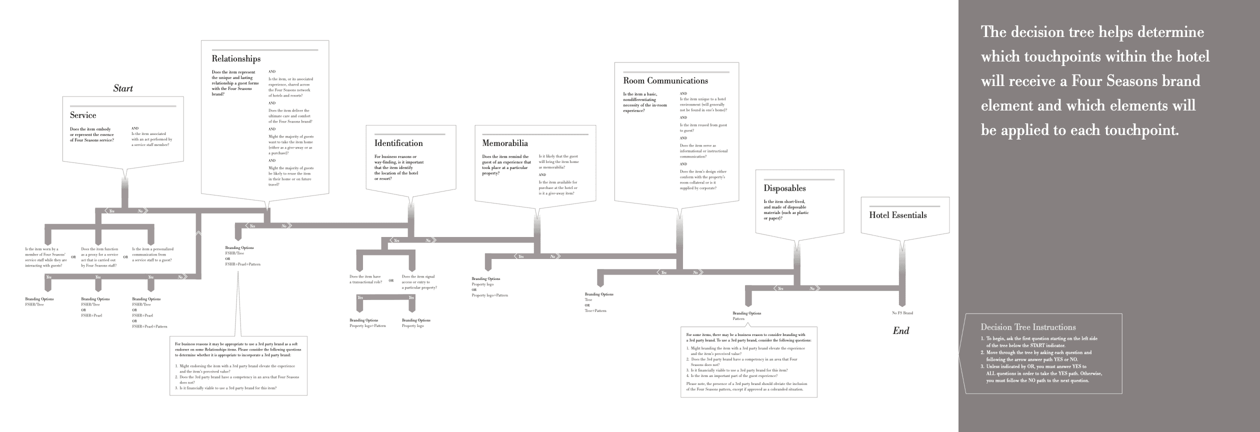 Working as Strategy Director at Siegel+Gale, I led a team through nearly four months of work to answer this question for one of the world’s most iconic hospitality brands. We began with customer and employee research that informed three distinct strategic concepts representing credible positionings and creative concepts for the brand. Once Four Seasons selected a direction rooted in relationship-building and the guest experience, we developed a comprehensive visual identity system including a proprietary color palette and pattern, and a brand architecture decision tree that gave the marketing team a clear, repeatable framework for deciding how and whether any item should carry the Four Seasons brand. From a toothpick to a lobby to a staff name tag, every touchpoint had a principled answer that could be applied consistently within any property around the globe, whether owned or franchised.